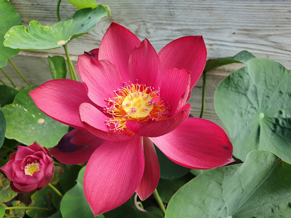 Parmi les plus beaux lotus rouges! ‘Ancient Capital Red Palace’ est extrêmement florifère avec des fleurs très au-dessus du feuillage. Les extrémités des étamines sont généralement rouges foncées! Les bourgeons pourpres sont ravissants. Terrible!