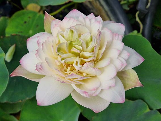 Fleur : double versicolore à dominante crème, nacre et vert (15-20 cm Ø)