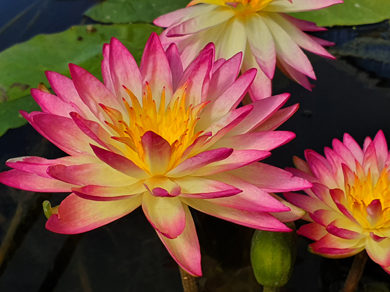 Hybridé par Florian Henaux. Le plus incroyable des nymphéas rustiques que nous ayons eu la chance de cultiver au Jardin Nelumbo! ‘Alice Henaux’ est un constant bouquet de fleurs bicolores. La base des pétales est jaune et les pointes sont flammées de rose framboise! Extraordinaire!!! Une grande première dans le monde des ISG. Pas étonnant que Florian ait dédié ce nymphéa unique pour sa fille Alice! Actuellement le plus épatant nymphea ISG rustique de notre collection avec ‘Jardin Nelumbo’!