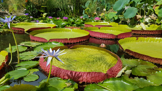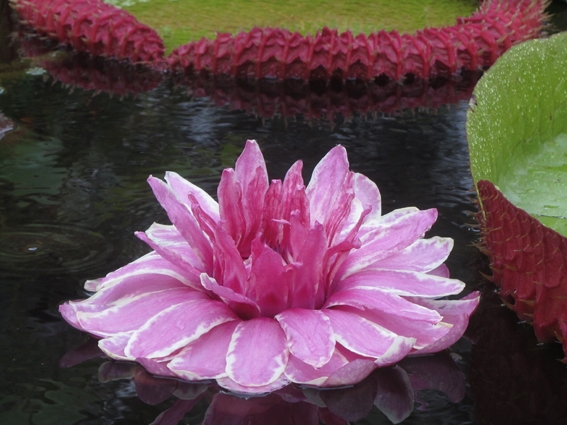 Catégorie : nénuphar géant à plateaux et recouvert d’épines coriaces sur presque tous les organes de la plante hormis sur la face supérieure des feuilles. Il est issu de l’hybridation du Victoria cruziana et de Victoria amazonica ! Son obtenteur, Patrick Nutt, fut le premier à oser ce mariage improbable au Longwood Garden en 1960… Le Longwood dépasse en tout point ses deux parents : feuilles plus grandes, fleurs plus grosses et plus nombreuses, bordures des plateaux rouges, fleur en deuxième nuit d’un rose plus soutenu, floraison plus précoce dans la saison et plus tôt dans la soirée… Le Victoria ‘Hybrid Longwood’ est le nymphéa de tous les superlatifs !!!